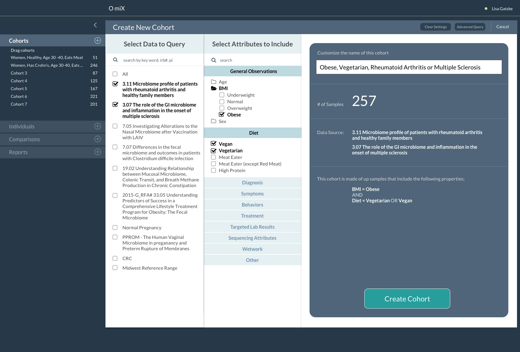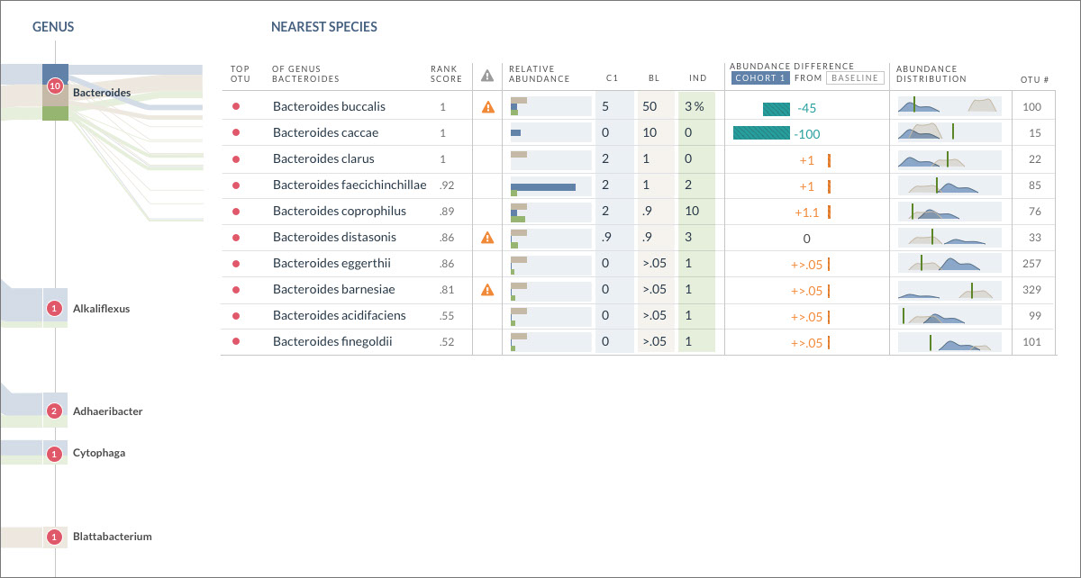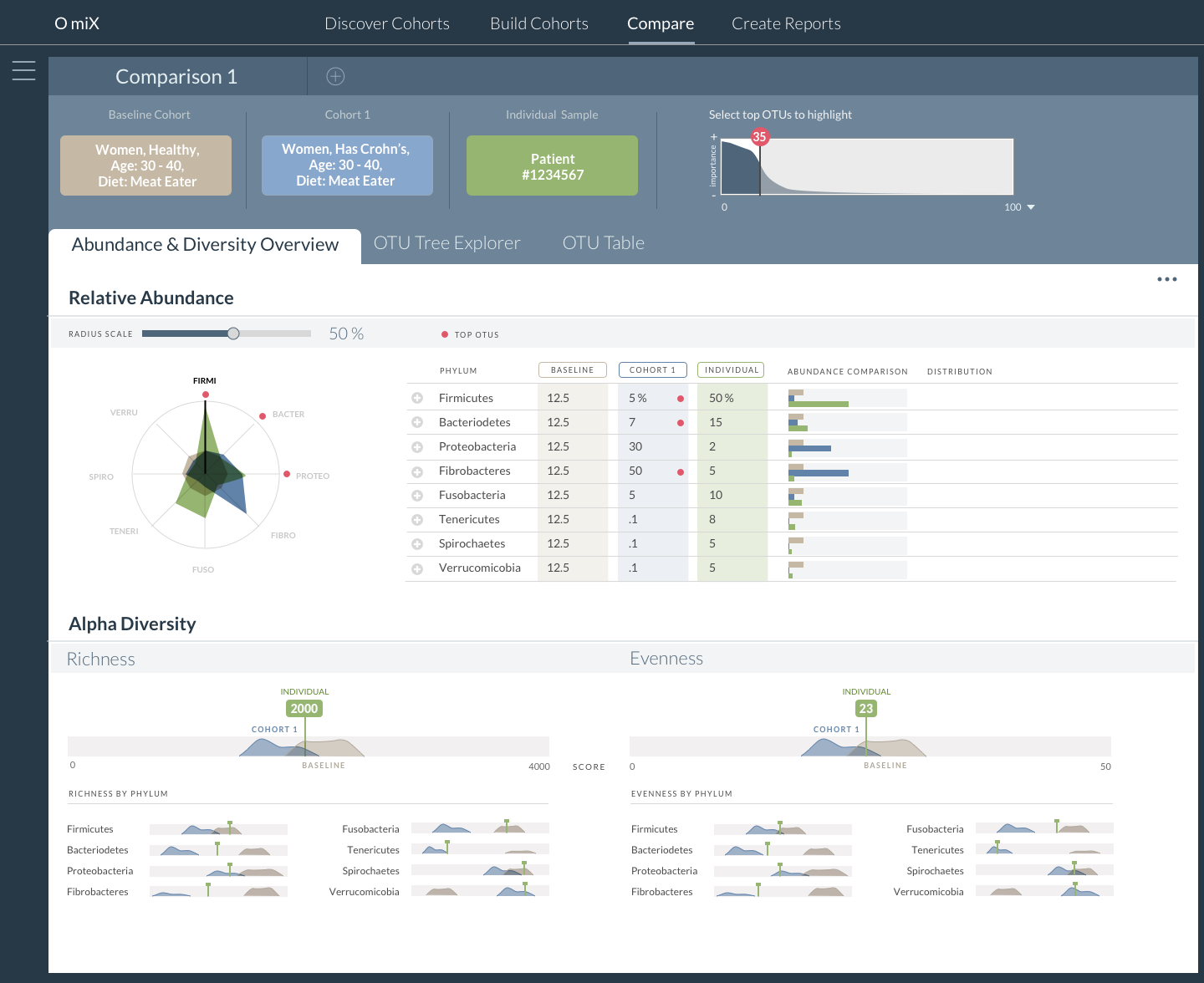 With this tool researchers are able to effectively visualize and study the microbial populations of healthy individuals and patients with various diseases including colon cancer, rheumatoid arthritis and intestinal infections. Data about specific patients is visually portrayed in the context of other cohorts – a healthy cohort, and a cohort of people with the same disease. This method allows the viewer to see the distribution range of others so they can more clearly understand how their patient compares to others. Simply comparing a patient to an average “normal” patient is misleading when there is wide variation in what constitutes “normal”.